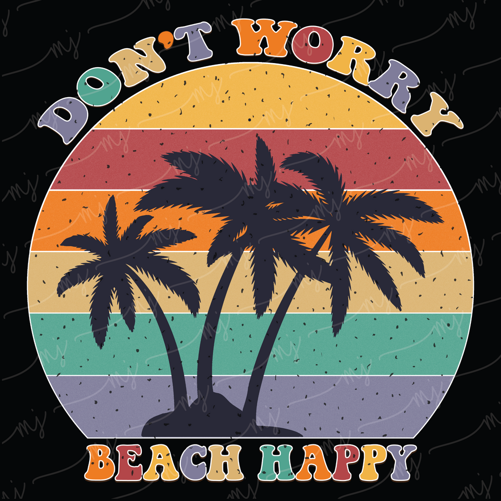 - Design: "Don't Worry Beach Happy" with retro typography, rainbow colors, and palm tree graphics