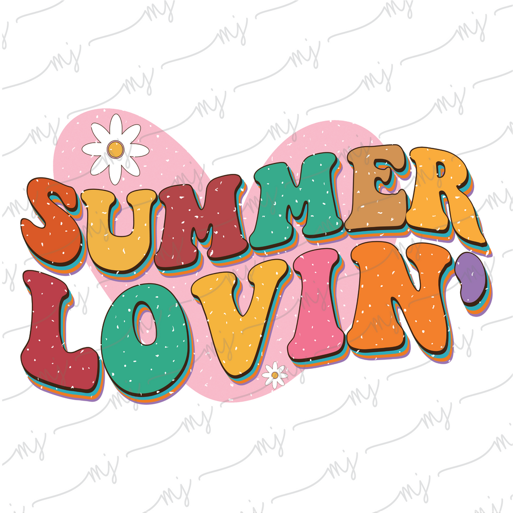 - Design: "Summer Lovin'" with retro typography, heart, and white flower with yellow center graphics