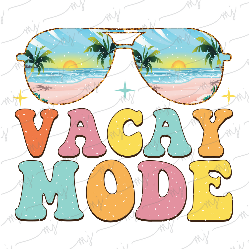 • Design: "Vacay Mode" with retro typography, palm tree, and sun graphics