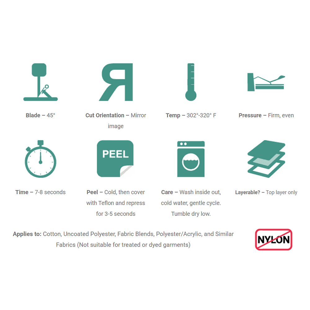Applies to: Cotton, Uncoated Polyester, Fabric Blends, Polyester/Acrylic, and Similar Fabrics (Not suitable for treated or dyed garments) Excluding Nylon